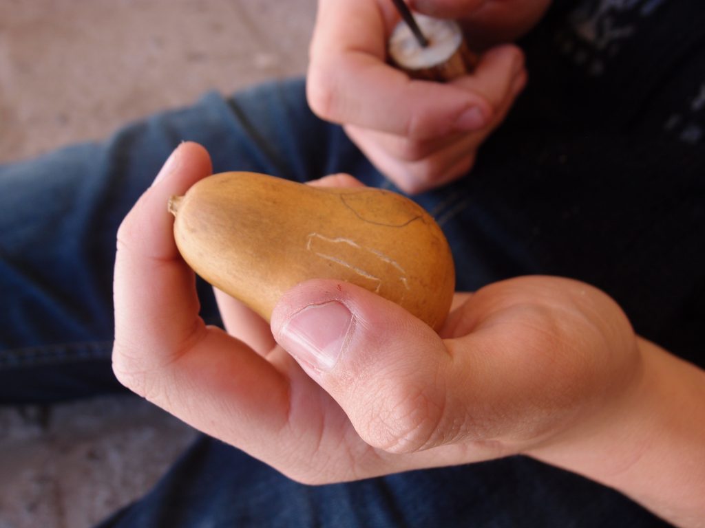 Beatrice focusing on carving her gourd